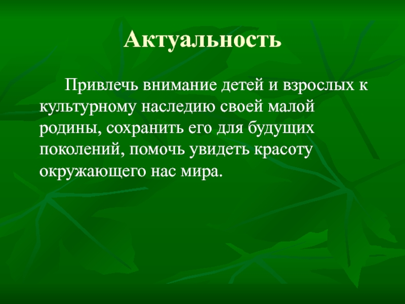 Привлечь внимание детей и взрослых к культурному наследию своей малой родины, сохранить его для будущих поколений, помочь увидеть красоту окружающего нас мира.
