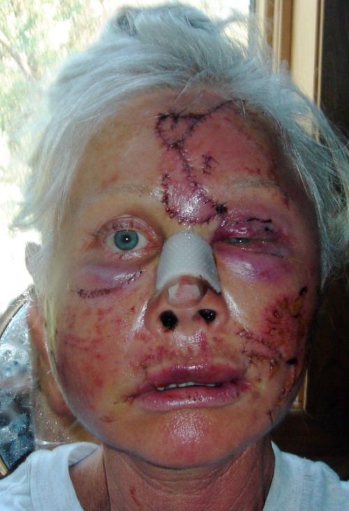 Жительница США Алена Хансен год назад стала жертвой нападения огромного черного медведя, который напал на нее в то время, как она работала на своем ранчо в горах Южной Сьерры. Мощным ударом своей лапы медведь буквально снял с женщины скальп. Ей повезло, что после удара, медведь отвлекся на лающих неподалеку собак. Что самое удивительное, ей удалось добраться до своего автомобиля и доехать! до пожарной станции, где ей оказали первую помощь и вызвали медиков. Сразу хочу предупредить, далее фото не для слабонервных .