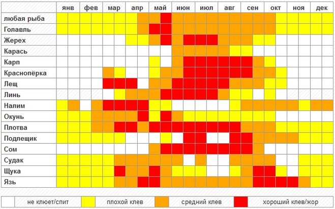 На данном рисунке вы можете посмотреть зависимость активности клева рыб от времени года и месяца: