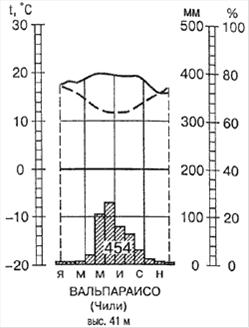 В приморской части Чилийских Анд климат субтропический, с сухим летом и влажной зимой. Район распространения этого климата охватывает побережье между 29 и 37° ю. ш., Центральную долину и нижние части западных склонов Главной Кордильеры. На севере намечается переход к полупустыням, а к югу увеличение осадков и постепенное исчезновение периода летней засухи знаменуют переход к условиям океанического климата умеренных широт. По мере удаления от побережья климат становится более континентальным и сухим, чем на берегах Тихого океана В Вальпараисо температура самого прохладного месяца + 11 °С, а самого теплого +17, +18 °С, сезонные амплитуды температуры невелики. В Центральной долине они более ощутимы. В Сантьяго средняя температура самого холодного месяца +7, +8 °С, а самого теплого +20 °С. Осадков выпадает немного, количество их возрастает с севера на юг и с востока на запад. В Сантьяго выпадает около 350 мм, в Вальдивии - 750 мм. Земледелие в этих районах требует искусственного орошения. По направлению к югу годовые суммы осадков быстро нарастают и различия в их распределении между летом и зимой почти стираются. На западных склонах Главной Кордильеры осадки возрастают, но на ее восточном склоне их вновь становится очень мало.