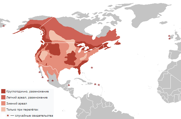 Распространён на обширной территории Северной Америки: на севере ареал ограничен Алеутскими островами, центральной Аляской, центральной Канадой до Лабрадора и Ньюфаундленда; на юге Нижней Калифорнией в Мексике, американским штатом Нью-Мексико и побережьем Мексиканского залива вплоть до Флориды. Плотность гнездовий представлена неравномерно — наибольшее количество птиц зарегистрировано в американских штатах Флорида, Виргиния, Мериленд, Мэн и Вашингтон, а также в районах вокруг Великих озёр.