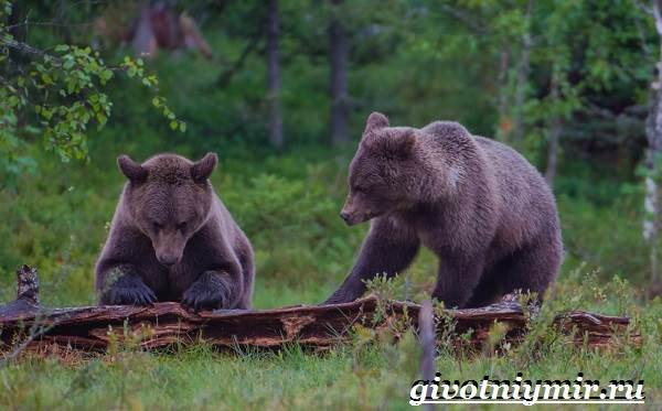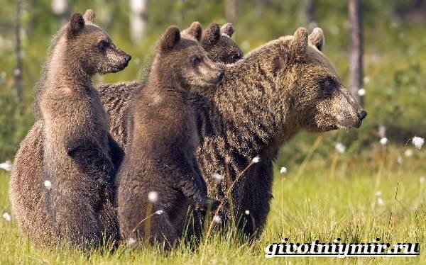 Мать кормит детенышей около 120 дней, далее они переходят на растительную пищу. По питательности медвежье молоко в 4 раза превосходит коровье. Часто медвежата из прошлого приплода заботятся о своих младших братьях, присматривают за ними и пытаются охранять. Про бурого медведя можно однозначно сказать: отец из него никакой.