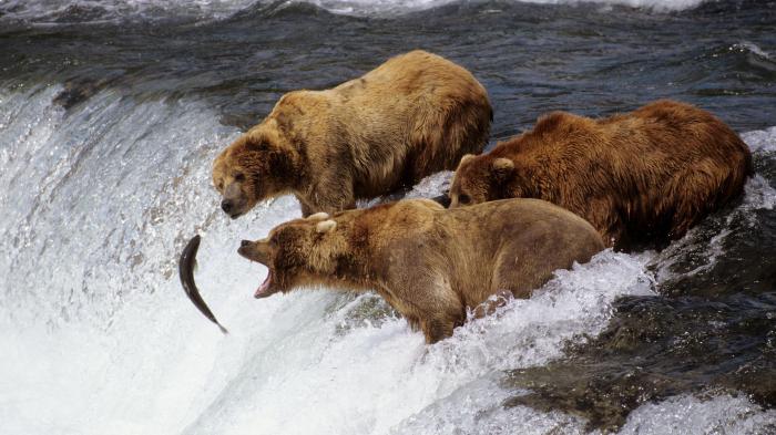 Самым удивительным занятием медведей является ловля рыбы. Они отправляются к дальневосточным нерестовым рекам, где массово скапливаются лососи. Особенно часто здесь промышляют медведицы со своим потомством. Мать умело ловит лосося и относит его своим детенышам.