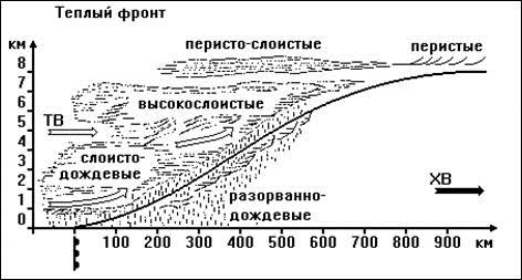 Прохождение теплого фронта обычно сопровождается мощной слоисто-дождевой облачностью с обложным дождем. Первый вестник теплого фронта – перистые облака, постепенно превращающиеся в сплошные перисто-слоистые. Падает давление. Чем ближе к линии атмосферного фронта, тем плотнее становятся облака. Затем облака становятся ниже, ветер усиливается и меняет свое направление. Начинается мелкий дождь или снег. Когда теплый фронт миновал, дождь или снег прекратился, тучи рассеиваются, наступает потепление – пришла более теплая воздушная масса.