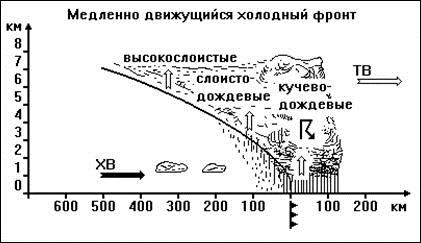 Если теплый воздух отступает, а холодный рассеивается вслед за ним – значит, приближается холодный фронт. Теплый воздух быстро вытесняется вверх, и создаются мощные нагромождения кучевых и кучево-дождевых облаков. Облака холодного фронта несут ливни, грозы, сопровождающиеся сильным порывистым ветром. Так как холодный фронт движется обычно быстро, бурная погода продолжается недолго – от 15-20 мин до 2-3 ч. В результате взаимодействия холодного воздуха с теплой подстилающей поверхностью образуются отдельные кучевые облака с просветами. Затем наступает прояснение.