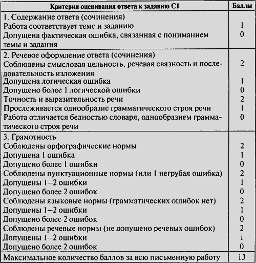 Часть С состоит из одного задания и представляет собой небольшую письменную работу (связный ответ или сочинение), выполняемую на отдельном листе бумаги. Оценка выполнения таких заданий является политомической. За каждый критерий учащийся получает баллы, из которых складывается суммарный балл.
