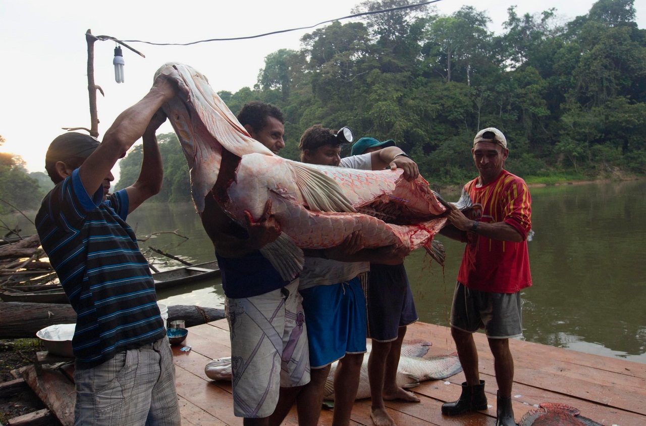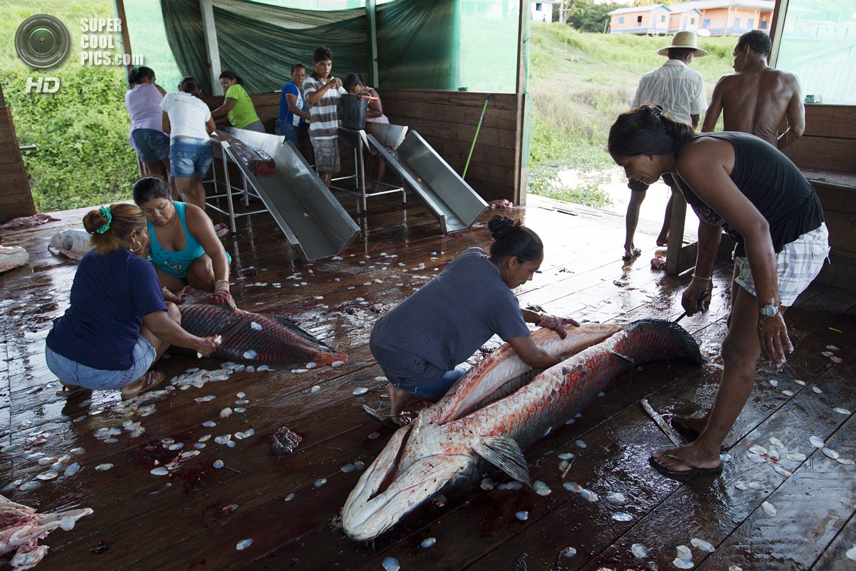 Жители деревушки Медио Журуа (Medio Jurua) демонстрируют выпотрошенную пираруку на озере Манария, муниципалитет Карауари, штат Амазонас, Бразилия, 3 сентября 2012 года. Пираруку – крупнейшая пресноводная рыба Южной Америки.