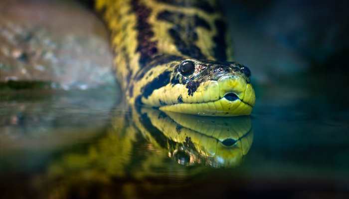 Продолжая тему об исполинских рептилиях, следует вспомнить о самой большой змее во всем мире, обитающей в Амазонии: анаконде. Хотя сетчатые питоны на самом деле считаются самими длинными змеями, зеленые анаконды намного тяжелее; самки, как правило, крупнее, чем их самцы и способны вырастать до девяти метров (более 29 футов) в длину, набирать в весе 250 килограмм (550 фунтов), и достигать 30 сантиметров (12 дюймов) в диаметре. Это не ядовитые змеи, но вместо яда они полагаются на свою огромную мускульную силу, чтобы сжимать мертвой хваткой и душить свою добычу, среди которой можно встретить капибару, каймана, оленя и даже ягуара. Ей по душе мелководье, которое позволяет ей скрытно подкрадываться к своей добыче. Как правило, эти змеи обитают в притоках Амазонки, а не в главном русле реки.
