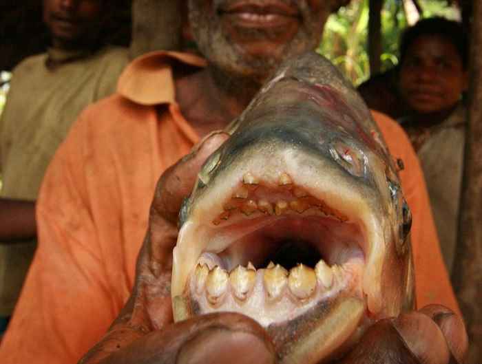 Наверняка это животное гораздо опаснее для мужского, чем для женского пола, это паку, которая более крупнее своего ближайшего родственника, пираний и известна своими характерными человекоподобными зубами. Они очень похожи на пиранью, но имеют более плоские, более сильные зубы, предназначенные для дробления, и как сообщается, один рыбак умер после того, как ему откусили его яички.