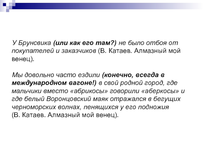 Мы довольно часто ездили (конечно, всегда в международном вагоне!) в свой родной город, где мальчики вместо «абрикосы» говорили «аберкосы» и где белый Воронцовский маяк отражался в бегущих черноморских волнах, пенящихся у его подножия (В. Катаев. Алмазный мой венец).