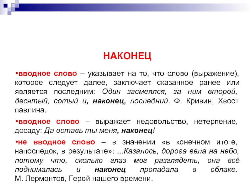 вводное слово – указывает на то, что слово (выражение), которое следует далее, заключает сказанное ранее или является последним: Один засмеялся, за ним второй, десятый, сотый и, наконец, последний. Ф. Кривин, Хвост павлина.