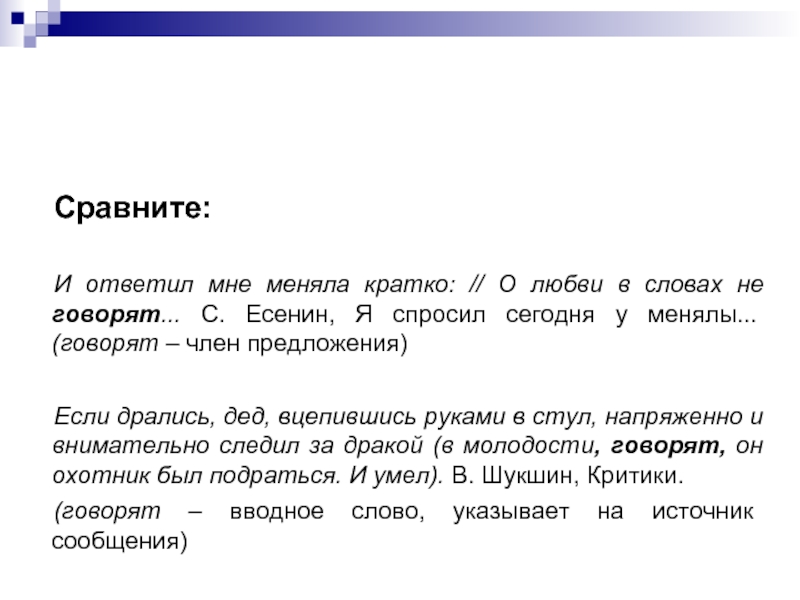 И ответил мне меняла кратко: // О любви в словах не говорят. С. Есенин, Я спросил сегодня у менялы. (говорят – член предложения)