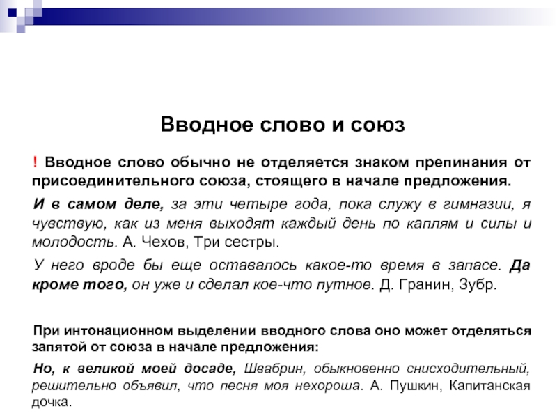В большинстве случаев одни и те же слова могут употребляться как в роли вводных, так и в роли членов предложения (как правило, сказуемых или обстоятельств) или служебных слов (союзов, частиц). Их надо различать.
