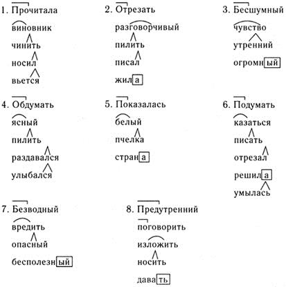 I. Сумерки сгущаются; бесследно исчезнуть в темноте; бесснежная зима; громко рассмеяться; здание школы; сжал руку; сделал правильно; здешний климат; сбил огонь; красивая роспись; расписаться в журнале; бесчисленные вопросы; хмурый рассвет.