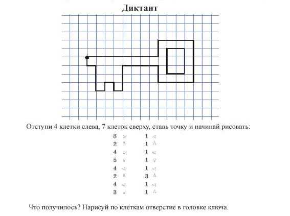 Учитель говорит например: проведи линию вправо на 2 клеточки, теперь вверх на 1 клетку и вниз на 5 и т.д.