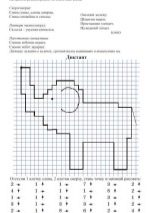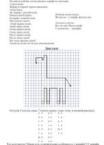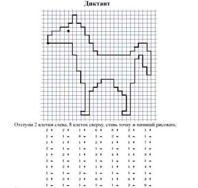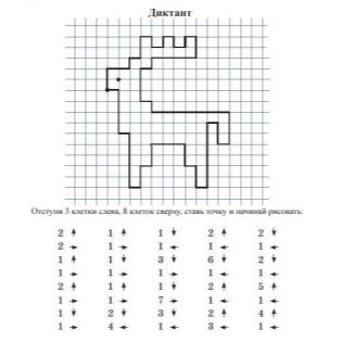 Задания средней сложности предполагают умение хорошо считать не только в первом десятке. Расширяются возможности движения под углом в указанном направлении. Такие диктанты могут быть выполнены не только одним цветом. Рисунки становятся более реалистичными.
