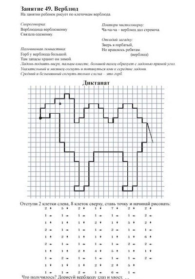 Ребеночек чертит график, картинку под диктовку. Педагог дает устную инструкцию о том, сколько клеток и в каком направлении нужно вести линию. После окончания работы сверьте полученный результат с образцом.