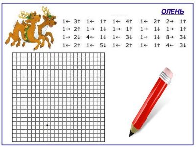 На готовом листе для педагога есть рисунок, координатная плоскость, состоящая из стрелок, цифр. Например, чтобы нарисовать елочку, проложите линию по горизонтали в 1 клеточку, по вертикали – 3 клеточки, наискосок – 3 клеточки и так далее. Чаще это просто стрелочки и цифры без слов.