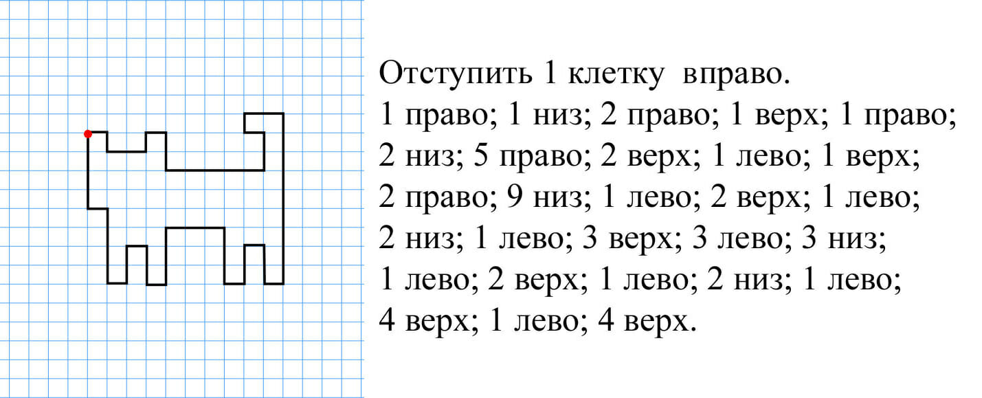 следует читать: 1 клетка вправо, 3 клетки вверх, 2 клетки влево, 4 клетки вниз, 1 клетка вправо.
