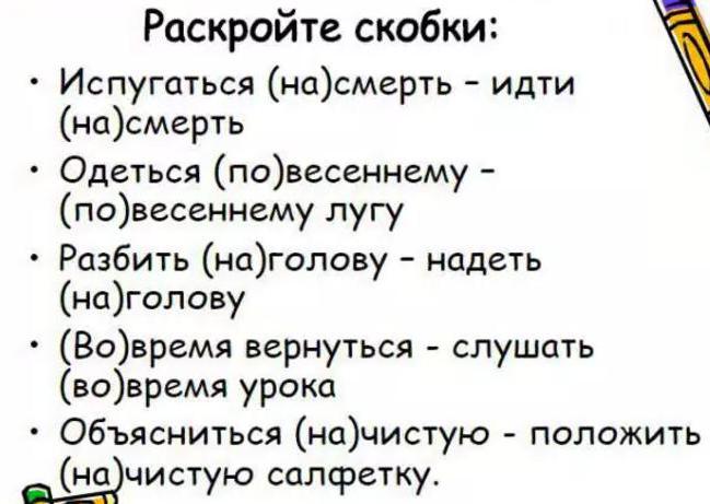Суть игры заключается в следующем: учащимся необходимо составить и записать словосочетания, в которых данные ниже слова писали бы и слитно, и раздельно.