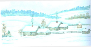 Короток зимний вечер. Синий сумрак выполз из леса и повис над сугробами. Резко хрустел под ногами. На звёздном небе появилась луна. Мороз крепчал. Вьюга намела большие сугробы. Деревья и кусты укрылись хлопьями снега. Старые пни надели на головы пушистые шапки. Поздним вечером мы подъехали к сторожке лесника. Маленький домик было чуть видно. Мы затопили печь. Ярко запылал огонь. В избушке стало тепло и уютно.
