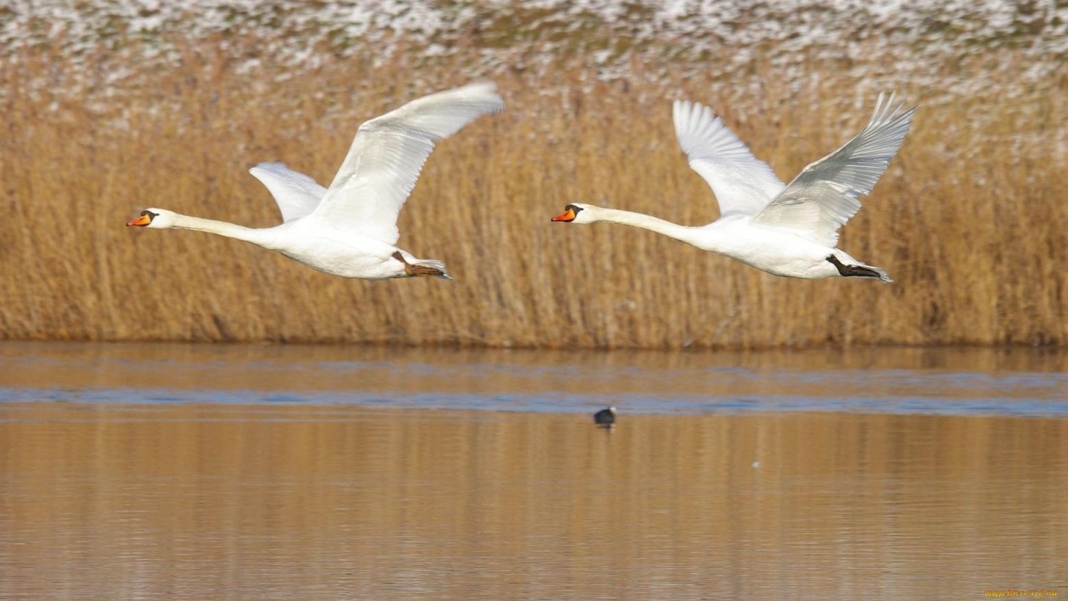Однако лебедь не относится к певчим птицам. Гогот или гулкие трубные звуки можно услышать весной. В это время лебеди возвращаются с зимовки и пролетают парами в поднебесье.