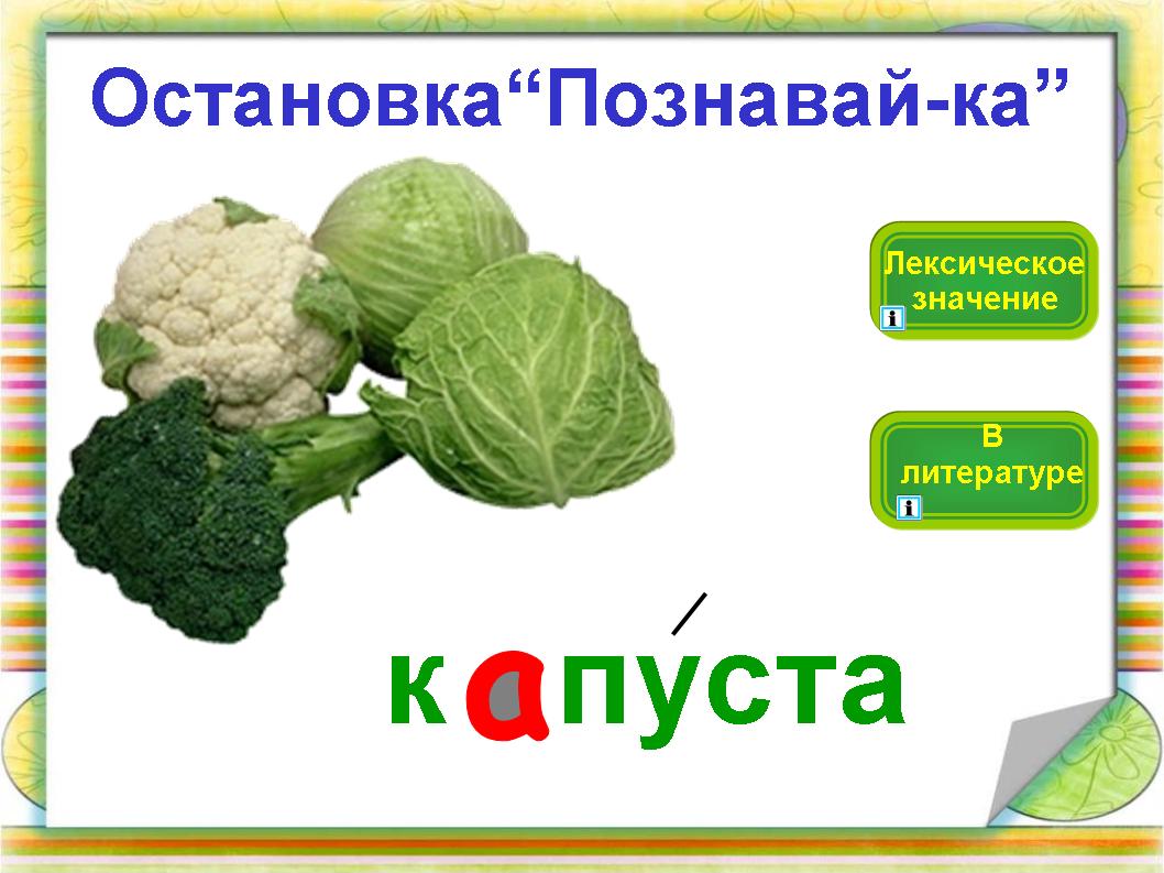– Это новое словарное слово. Запишите его в тетрадь, подберите слова-родственники и запишите. (Запись в тетради: Капуста, капустный лист, капустница.)