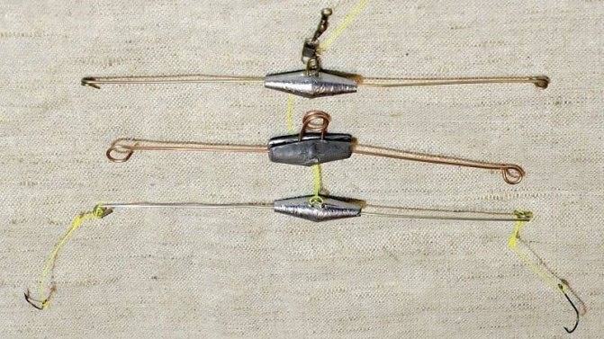 Донку часто оснащают двумя крючками. Но при ловле леща используют длинные поводки, и если их поставить два, они будут путаться между собой. Поэтому используют оснастку типа «коромысло». Оснастку на два крючка легко можно сделать своими руками. Она позволяет поставить два длинных поводка на донку, и они не будут друг другу мешать. Коромысло обязательно ставят на вертлюжок, чтобы оно не перекручивало леску при вытаскивании. Хорошее коромысло на два крючка имеет небольшой вес и почти не влияет на регистрацию поклёвок. Понять, как коромысло себя ведёт, можно только в процессе ловли. Бывает, что проще использовать один поводок и крючок.