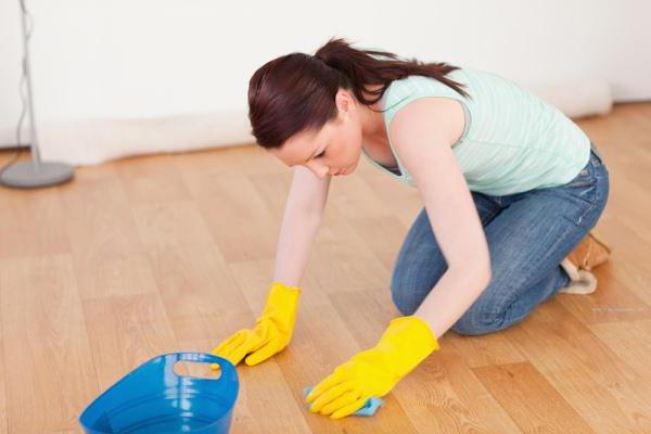 Паркет и ламинат чистите специализированными средствами для таких покрытий. Добавляйте их в теплую или холодную воду. Протирайте ламинат хорошо отжатой тряпкой. Такие полы рекомендуется иногда натирать специальной мастикой. Ламинатный пол берегите от излишков влаги.