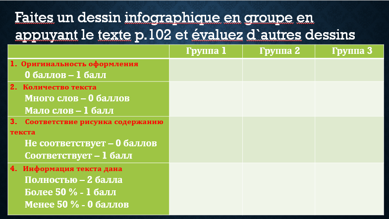 Работа в группах по созданию инфографического рисунка по тексту с.102