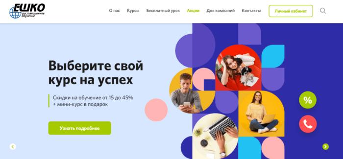 ЕШКО – это школа удаленного обучения, в которой каждый желающий может получить дополнительное образование. Студентам предлагается более 80-ти курсов из разных категорий (например, иностранные языки, финансы и учет, управление бизнесом, дизайн, психология и педагогика, компьютерные технологии). Записаться на курс можно на официальном сайте. Обучение курируется личным преподавателем, при необходимости можно сделать перерыв. Студенты имеют возможность оплачивать обучение помесячно или оплатить сразу весь курс (в этом случае предоставляется скидка). Каждому студенту предоставляется личный кабинет, который помогает сделать обучение максимально удобным и эффективным.