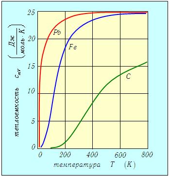 Рис. 2.11. Зависимость молярной теплоемкости для трех химических элементов - кристаллов свинца, железа и углерода (алмаза) - от температуры