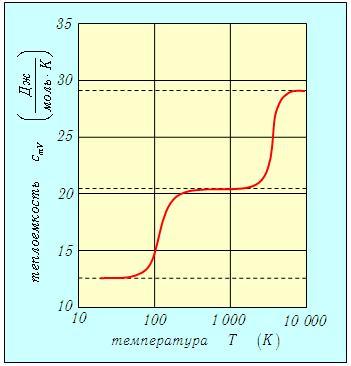 что указывает на отсутствие у молекулы как вращательных, так и колебательных степеней свободы. Далее с ростом температуры теплоемкость быстро возрастает до классического значения