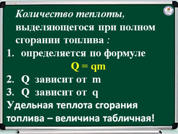 9. Удельной теплотой сгорания топлива q называется скалярная величина, равная количеству теплоты, которое выделит топливо массой 1 кг при полном сгорании.