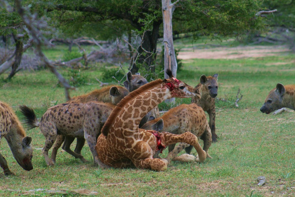 Стая гиен поймала молодого жирафа.