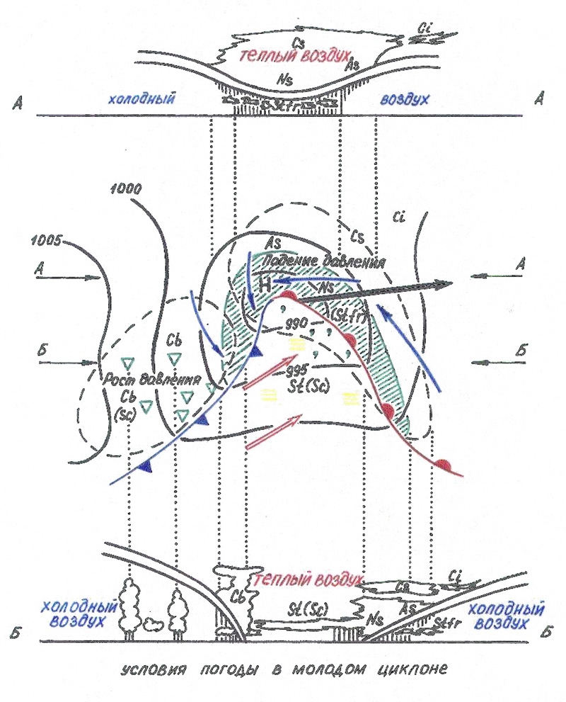 Теплый воздух в молодом циклоне движется быстрее, чем перемещается само возмущение. Поэтому через возмещение протекает все новый и новый теплый воздух, опускающийся по холодному клину в тылу циклона и восходящий в его передней части.