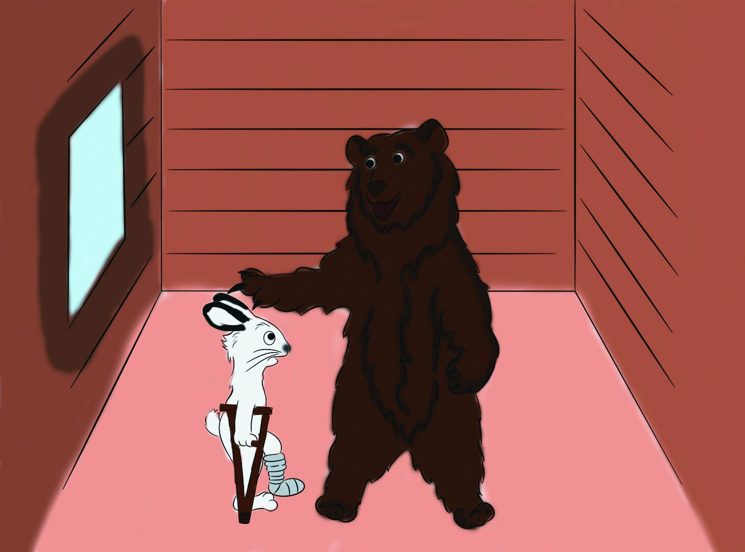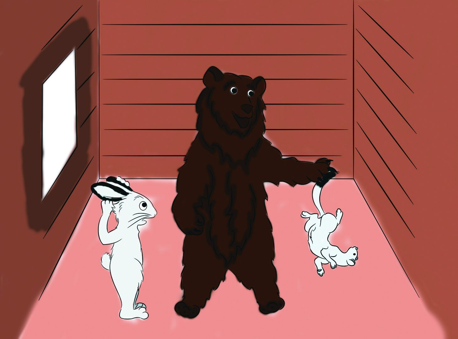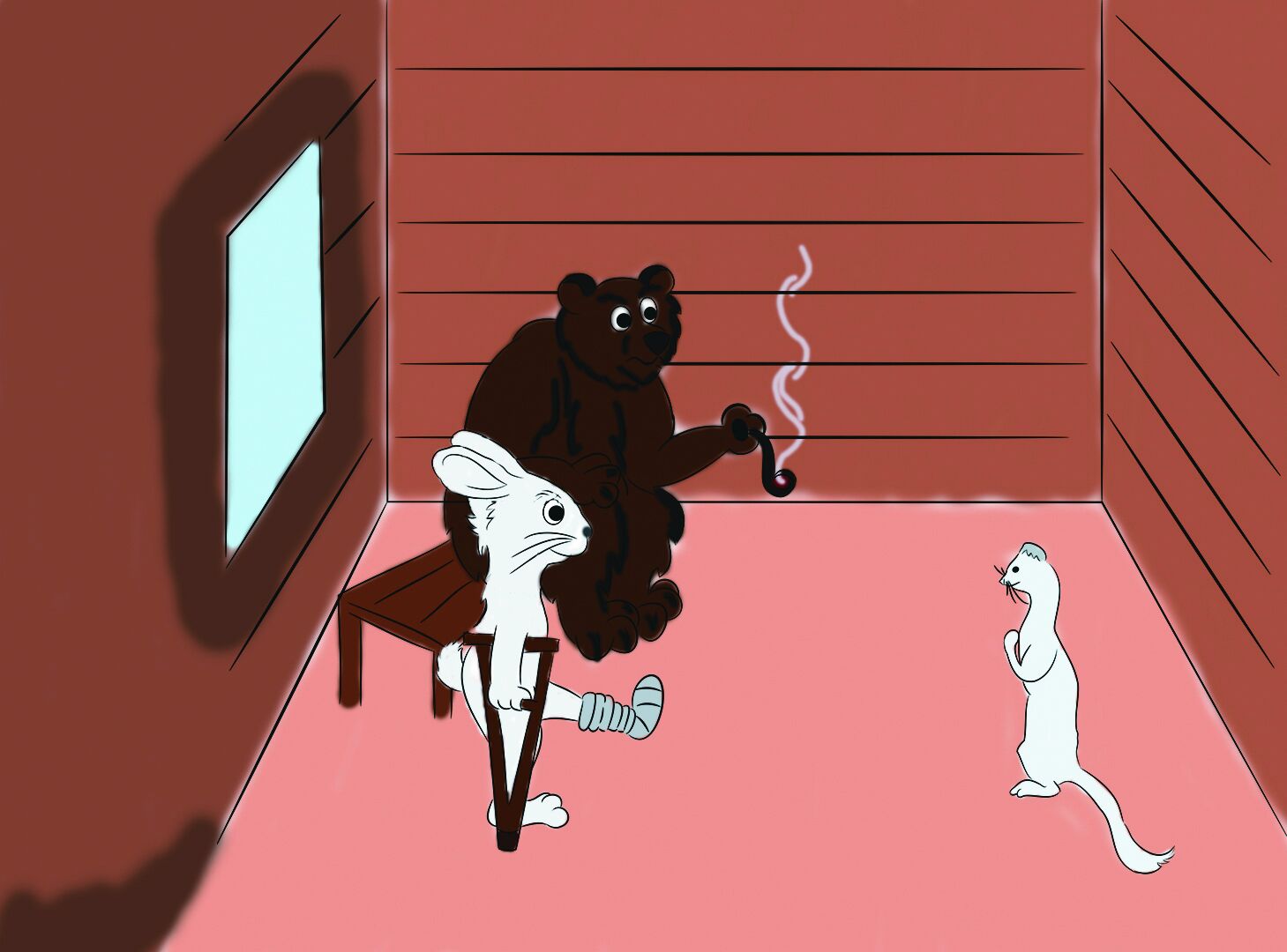 Поднял глаза горностай - сидит медведь на почётном месте, курит степенно трубку. А по правую сторону от хозяина - заяц. Лапу хромую вперёд выставил, на костыль деревянный опирается.
