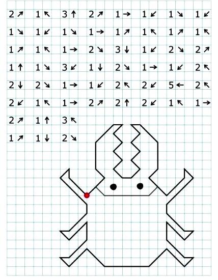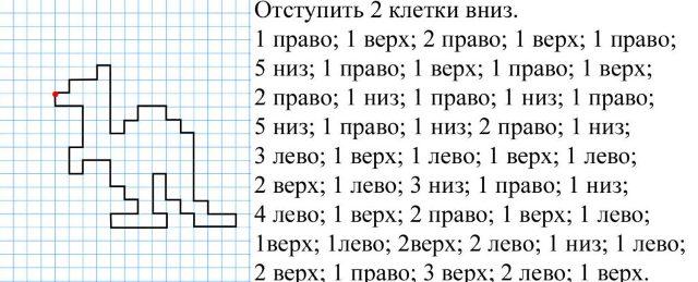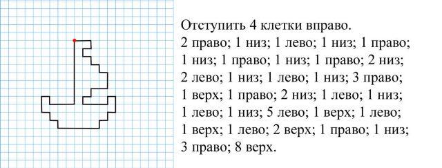 «Теперь поставь карандаш на самую нижнюю точку. Внимание! Три клетки вправо. Одна клетка вверх. Одна клетка влево. Две клетки вверх. Три клетки вправо. Две клетки вниз. Одна клетка влево. Одна клетка вниз. Три клетки вправо. Одна клетка вверх. Одна клетка влево. Две клетки вверх. Теперь продолжай рисовать узор сам».