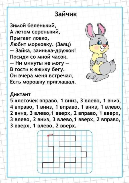 Диктанты бывают нескольких вариантов. Одни из них предполагают только движение вверх, вниз, вправо, влево в пределах 10-ти, без движения по диагонали, другие - более сложные, с угловыми передвижениями.