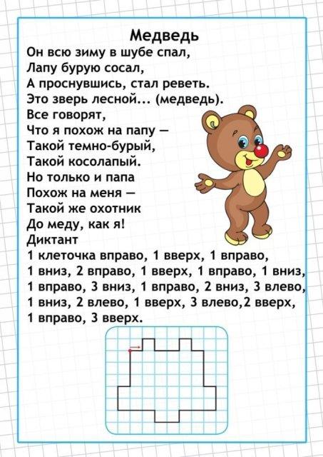 Диктант заключается в рисовании по клеточкам, соответственно, под диктовку родителя или воспитателя. Поэтому еще одно важное умение развивают в ребенке диктанты, и в частности графический диктант - он учит слушать и слышать, сосредоточиться на том, что говорит учитель, а это практически самое важное для школы умение.