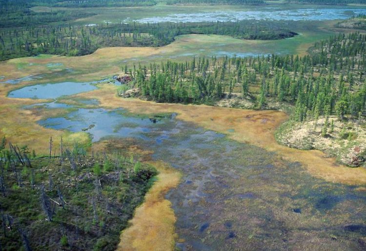 Годовая сумма осадков в лесотундре 150- 450 мм, что намного больше величины испаряемост и. Положительный баланс влаги и многолетняя мерзлота способствуют широкому развитию заболачивания, а термокарст – образованию мелководных озер. Лесотундра – одна из наиболее заболоченных природных зон. В отличие от тундры в ней наряду с гипновыми широко распространены сфагновые болота и начинают встречаться торфяники, иногда значительной мощности. Поверхность торфяных болот неровная: мелкие и крупные бугры чередуются с влажными мочажинами или мелкими озерками.