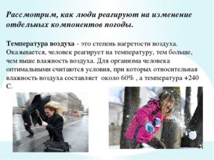Рассмотрим, как люди реагируют на изменение отдельных компонентов погоды. Температура воздуха - это степень нагретости воздуха. Оказывается, человек реагирует на температуру, тем больше, чем выше влажность воздуха. Для организма человека оптимальными считаются условия, при которых относительная влажность воздуха составляет около 60% , а температура +240 С.