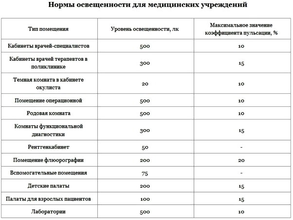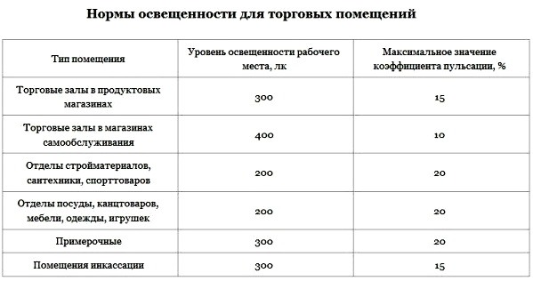 Нормативы освещенности для различных типов помещений
