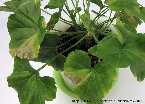 Признаки. У листочков герани появляется сухая желтая кайма темного, почти коричневого оттенка. Пигментация заметна на всем растении.