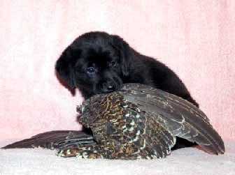 Выполняется практически в самом начале: Познакомьте щенка с разными запахами материала: уткой, полевой дичью, лесной птицей и тд. Запишите ему в память эти волнующие моменты, я уверяю вас, он никогда их не забудет. Но знакомство должно быть произведено грамотно: усадите щенка рядом, придержите чуть за ошейник и незаметно вынесите в правой руке из-за спины птицу так, чтобы она оказалась см в 2-х чуть выше носика ученика. Подержите секунд 5-10, чтоб увидеть, как малыш потянулся к ней, как зашевелились его ноздри и загорелись глаза. И снова уберите в упаковку. Всплеск в сознании щенка должен остаться. Повторяйте это упражнение изредка, между основными этапами обучения, чередуя запахи птицы на разных занятиях. И только тогда, когда вы пройдете с малышом этапы обучения по удержанию различных предметов в пасти, вот тогда вы сможете аккуратно вложить щенку в рот птицу, уже знакомую по запаху. Возможно, хорошо мотивированный ученик сразу возьмет птичку в пасть. Спокойно похвалите его, погладьте и аккуратно поменяйте на кусочек. Эмоции ваши должны быть под полным контролем, иначе включите тот самый ранний и очень нежелательный азарт, приводящий к жесткой хватке. Возможно, щенок удивленно, или испуганно отринется в сторону от птицы в вашей руке. Не пугайтесь, и не расстраивайтесь! Постепенно, он привыкнет и перестанет побаиваться волнующего запаха тушки. Старайтесь не включать в знакомство свежебитую окровавленную дичь, особенно,если щенок побаивается или, наоборот, достаточно агрессивен к тушке.