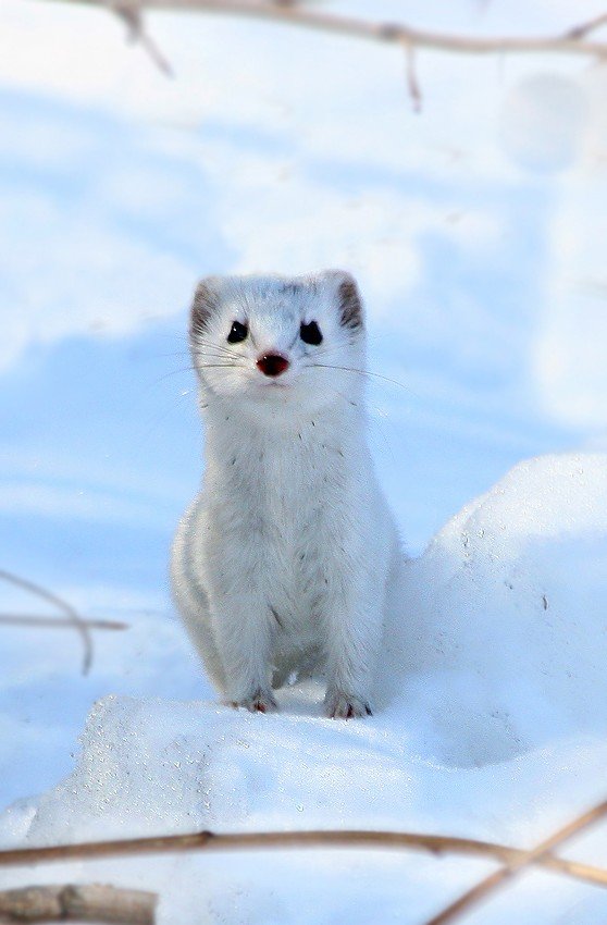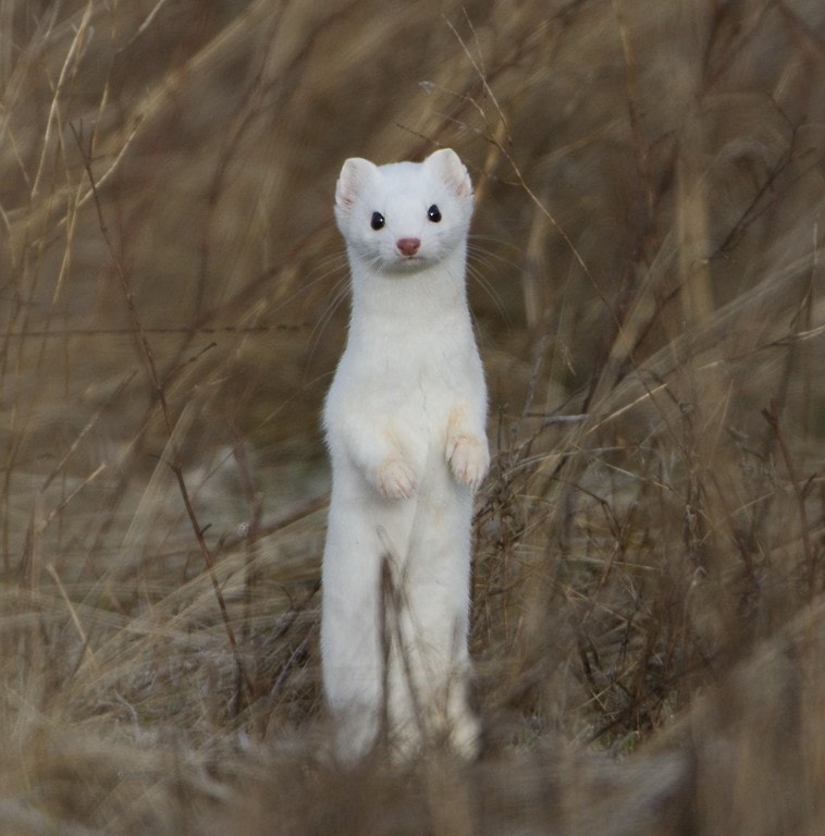 С наступление осенних холодов ласка линяет. Ее мех приобретает светлый окрас. На снегу зверек совершенно незаметен. Выдают его лишь крошечные черные глазки.