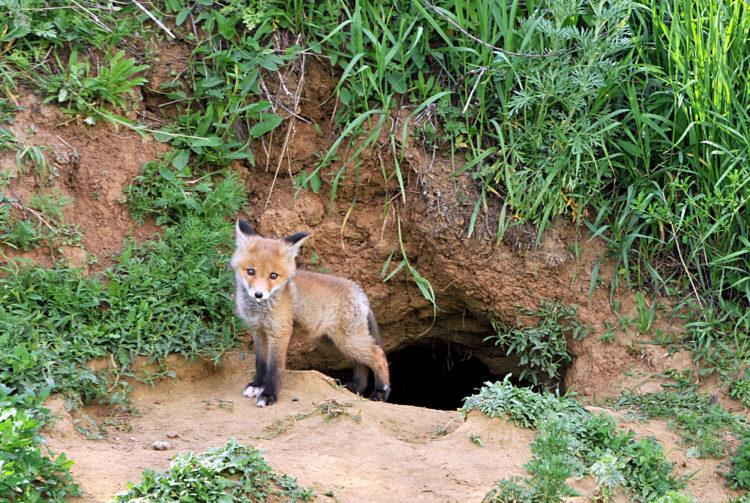 Обычно лисья выводная нора снабжена несколькими выходами – отнорками, которые позволяют ей в случае опасности незаметно покинуть свое убежище. Главный отнорок, которым лиса регулярно пользуется для входа и выхода, заметен издали. Обычно это чистая площадка, посыпанная песком, который появился здесь в результате многолетней чистки норы. Здесь частенько можно увидеть играющих лисят.