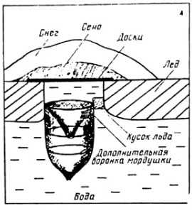 В Якутии, помимо мордушек обычного типа, используют ловушки с дополнительно направляющей воронкой. Подробнее о ловле ондатры в Якутии. Устанавливают мордушку так, чтобы верхний край воронки находился на одном уровне с нижней границей льда, а сама воронка располагалась по направлению хода зверьков – смотрите рис.4. Благодаря этому приспособлению ондатра не может попасть в хатку, иначе как через воронку. Проверяют мордушки один раз в несколько дней. За один осмотр попадает от 5-ти и до 154-ти зверьков.