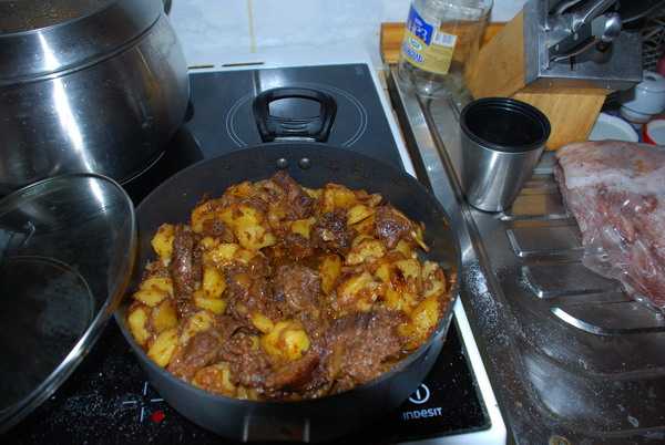 После обжарки мясо следует переложить в глубокую сковороду с толстым дном и добавить порезанные морковку и лук, залить овощным бульоном из расчета 500 мл на килограмм мяса, немного посолить и тушить под крышкой около часа. Хорошо улучшит вкус мяса полусладкое красное вино, которое вливают ( около 100 мл) за 20 минут до готовности. За 10 минут до готовности следует добавить несколько горошин черного перца и пару лавровых листиков.Хорошим гарниром к мясу будет картофельное пюре или отварные овощи, рис или салат.