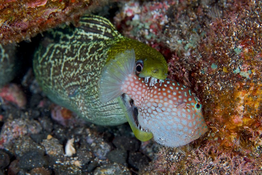 Метод охоты у мурен жесток. Она старается разорвать свою жертву на части и делает это очень быстро.